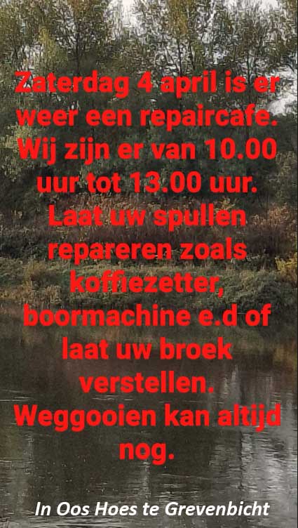 Wij zijn een tijd terug een repaircafe begonnen waar we gratis 1 maal in de maand van alles repareren en we deden dit in Obbicht.